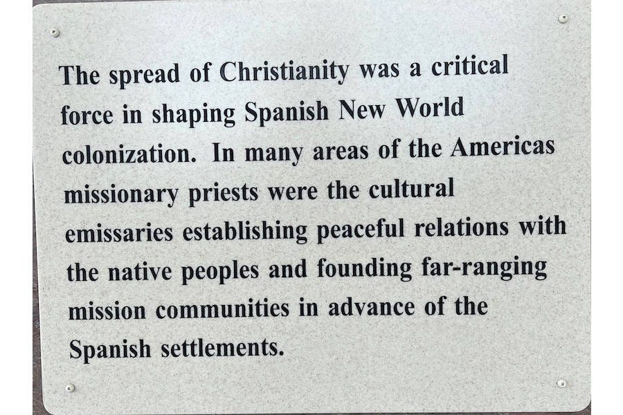 One present-day example to remind us of religious and state collaboration in the deeply rooted settler-colonial culture of violence is the oldest Catholic mission on US soil, Mission Nombre De Dios in St. Augustine (!), Florida. Established in 1565, it displays a statue of the priest who accompanied the Spanish military commander and a towering structure that can be viewed as both the Cross of Christ and the Sword of Constantine. The mission museum has a large banner of the Blessed Mother as patroness and protector of both missionaries and mercenaries. The inscription underneath the banner reads, “The spread of Christianity was a critical force in shaping Spanish New World colonization. In many areas of the Americas, priests were the cultural emissaries . . . founding mission communities in advance of Spanish settlements.” Native cultures and languages were suppressed in mission schools, along with erasure of Native peoples’ self-assigned identities. Thus, mercenaries and missionaries became agents and partners in colonial and cultural genocide of “indigenous” populations. The word indigenous is a colonial construct based on the French word indigenes (“Indians,” in English). Though within ten years of arriving in America, Europeans knew that India was on the other side of the planet, we continue to use colonial-era constructs of cultural erasure to refer to non-European Natives of all continents to this day. ♦