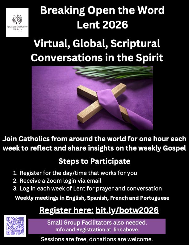 Ignatian Encounter Ministry is sponsoring “Breaking Open the Word: Lent 2026.” Each week of Lent, join others from around the world in small Zoom breakout groups for conversation around the weekly gospel. Choose from 27 different 1-hour meetings each week, available in 4 language groups (English, Spanish, French, and Portuguese). Meetings begin on Ash Wednesday, February 18. Information and registration is available here—a great way to build connections across the global church!