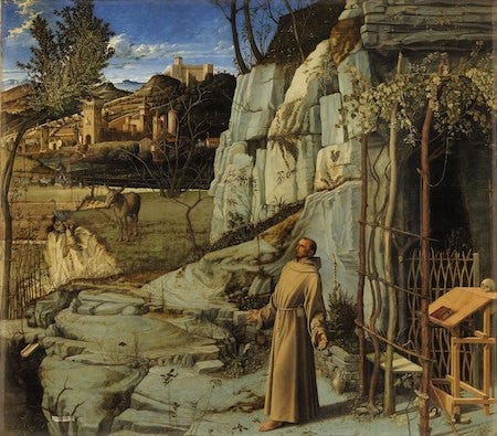 It is the displacement of knowing into singing that captivates me here. I am reminded of how praise is its own form of theology, of Bellini’s Saint Francis in the Desert as a kind of visual hymn to attentiveness “surpassing every intellect.” In the picture I always noticed what was in front of Francis—the plinth-like rock and swatch of blue sky, the laurel twisting overhead—but studying it more closely this morning I am aware of what is behind: the Bible on the lectern beneath the rustic arbor and the gate of woven branches before the entrance to the cave. The objects sing to me in their specificity, as evidence of a physical life that refracts the light of spiritual transformation. Francis, here, has turned from the Bible, but he has not turned away from it: he has opened himself from one dimension of the text to another, the text as teaching tool of the five senses that project their prayer of apperception: