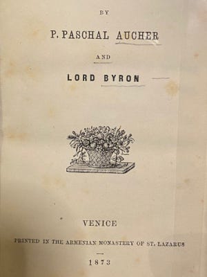 Frontispiece of an Armenian and English grammar coauthored by Lord Byron and Fr. Paschal Aucher at San Lazzaro and displayed at the Keats-Shelley House in Rome in October 2023. Photo by Michael Centore