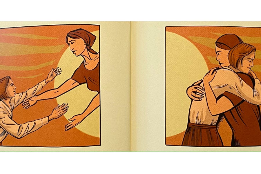 This commitment to beauty—and not a purely aesthetic beauty, but a beauty wedded to sacrifice, a beauty that costs something for the beholder—is the through line that links the lives of these two figures who are not so distant as they might first appear. Both were adult converts to their faith, Day to Catholicism and Pärt to Orthodoxy; Day reverenced the Eastern church, particularly its strain of Russian mysticism, while Pärt professed admiration for the Western Catholic intellectual tradition. Day’s path to spiritual maturity was a public, outward-facing one, taking her to the front lines of pickets and protests and inspiring broadsides against the prevailing social order even as it led her to a private, inward place of prayer; Pärt’s was more hidden, partly due to the circumstances of his life behind the Iron Curtain, partly to the solitary nature of his search to find “that one note that holds life,” yet was still punctuated by recitals of works that grew ever more religious the deeper he went into his faith and resulted in his becoming one of the most performed composers in the world. Perhaps most compellingly in a Cold War context, each mirrored for the other the dreams and drawbacks of their respective socioeconomic systems. Day, born in 1897, was radicalized in early adulthood by the suffragist and labor movements; even after her conversion in 1927, she remained sympathetic to what she once called the “dangerous goodness” of the Communist ideal and spent the rest of her life shaping a Catholic critique of the excesses of American capitalism, its soul-destroying avarice and sobornost-destroying individualism, its cults of consumption and imperial violence. Pärt, born a generation later in 1935, was a product of what happens when the hope of universal solidarity is captured by the State Planning Committee: every aspect of his creative output was vetted for adherence to the Soviet program, such that his 1968 composition Credo—an expressly sacred piece that incorporated the phrase “I believe in Jesus Christ” along with verses from the Sermon on the Mount—led to his unofficial ban from concert halls, and ultimately to his forced emigration from Estonia in 1980. Each, in a way, dissented from the world in which they lived at great personal cost; and each, in their dissent, witnessed to the fatal flaws of both Western notions of “freedom” and compulsory collectivism when they lack what Thomas Merton identified as the “divine cornerstone” of Christ. Fittingly for such protagonists, the two books trace their stories in complementary ways. Dorothy Day: Radical Devotion is done in color, with Cardinale’s crisp and vivid illustrations alternating perspectives and layout orientations from page to page. There is a cinematographic rhythm in the way they oscillate from close-up individual panels to widescreen full- and half-page spreads, or in the use of light and dark tones to set a mood or heighten dramatic tension. In depicting the more harrowing passages of Dorothy’s life—the death by overdose of a colleague in the labor movement and the abortion forced upon her by a particularly uncaring and callous partner—Cardinale tints the panels grayish blue, as if applying a gel to a camera’s lens. The abortion scene is one of the most visually arresting in the book. The stream of dialogue is suspended save for a few words between doctor and patient, and a series of images guides us silently through the procedure. Interspersed are four panels where a poster on the wall of the office showing a woman raising her hand in support of the International Workers of the World comes to life; the woman reaches out from two dimensions into three to give the ailing Dorothy a tender embrace. In these panels the blue tint is lifted, replaced with a russet orange—a visual cue to signal the warmth of this moment of sisterly support.