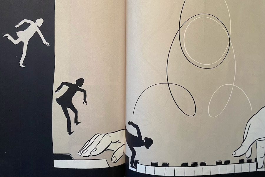 Like Korgen and Cardinale, Sildre paces us through his subject’s life in four stages. A prologue covers Pärt’s birth in 1935 through his matriculation into the Tallinn Conservatory at age 19. In part one, “Credo,” we follow his creative development as a student and sound engineer at Estonian Radio, his early experimental compositions and life-altering discoveries of Bach and the liturgical music of the Pühtitsa Convent. Part two, “Silentum,” picks up after the debut of Credo and subsequent banishment from public performance, leading to a time of artistic and spiritual searching that, as with Day’s peripatetic early years, results in a conversion to Christianity. “Tabula Rasa,” the third and final part, begins with a revitalized Pärt composing melodic lines for the psalms and documents the development of his now-famous “tintinnabuli” style—a compositional method influenced by Gregorian chant that was first introduced in his breakthrough piece, Für Alina, in 1976. Thus begins a prolific period that is interrupted when Soviet officials finally succeed in exiling him along with his wife and two young sons to Vienna in 1980, where the novel ends. For me, the climax of the book is in the section Sildre devotes to a solitary walk Pärt takes around the city of Tallinn after the fallout from Credo. It comes in the “Silentum” chapter covering the headiest days of his spiritual awakening, and the scene prior evokes his reading of the Desert Fathers as if to set the stage. Over twenty-two pages, we follow him through parks and beneath trees, down snowy city streets, into St. Nicholas Church to pray before Hermen Rode’s altarpiece, under a rain squall and along Tallinn Bay, all the while overhearing a soliloquy where he interrogates himself and his relationship to music, and music’s relationship to God. “Every sound must be like a jewel,” he tells himself at one point, “Just as every human soul is a jewel.” In the final eleven pages the background drops away, leaving his silhouette to fall and tumble, fly and climb across an abstracted representation of imageless prayer. The monologue picks up here, grows more verbose against the visual silence; it is impossible to do it justice by extrapolating quotes, but suffice it to say that Pärt’s self-talk in this section touches the depths of a heart-centered hesychastic spirituality. The final panel has him leaping off a thin white line angled into a black void in a moment of total surrender. It calls us back to an image earlier in the chapter where he opens his hands beneath a night sky specked with stars and makes the claim that gives the book its title: “Between two sounds there can be a cosmic distance.”