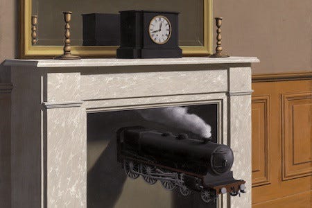 When Thoreau singled out his railroad breaching his idyll at Walden from a third of a mile away, he knew precisely what he was referring to. Our age is not so simple. We have railroads coming at us from all directions, infiltrating our lives down to the level of domestic space like the locomotive emerging from the fireplace in Magritte’s Time Transfixed. Thoreau’s “cloud-compeller”—his term for the steam-spewing engine—is our cloud computer, breaking information to bits and scattering it throughout the atmosphere. It is no wonder we experience information as precipitation constantly raining down on us, or as fog constantly obscuring. This is borne out by the way people speak: note the next time you hear the phrase “I feel” in place of “I know,” “I believe,” “I understand,” or “I think” to signal asseveration, and it will soon become apparent how we are all groping our way through the daily media miasma to state the most basic facts. This only complicates the naming of our railroads—which, again, are as numerous as there are interior idylls to disrupt, and which seem designed to abstract us from ourselves—and leaves us with the prevalent feeling of our historical moment: the interconnectedness of everything breaking down, and our powerlessness in the face of such an overwhelming systemic collapse. At the same time, we have never been more aware; the media miasma has fostered a period of peak opinion in which everyone has something to say about everything always even as it has occluded our perceptual powers of the kind nurtured in contemplation and reflection. We know there is something wrong, and yet the minute we label one problem, three more have sprung up in its place. We spend more time labeling than we do solving. Our age is a veritable taxonomy of despair. In such an environment, where can we hope to find the solid ground from which to act? Amidst the shifting sea of uncertainties—a sea which, like all the seas of our century, is rising to swallow bastions held to be secure—how do we find a foothold that we might still our tireless tongues and begin to engage our hands?