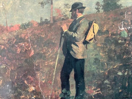 Contrast this with the two lodestars whose work I carry with me in my rucksack, and certainly had with me that day, Emerson and Thoreau. For the former it was a five-by-four-inch edition of “Nature” published on occasion of Penguin’s sixtieth anniversary and sold at the bargain-basement price of ninety-five cents; for the latter, the Bantam Classics edition of Walden and Other Writings with its cover of bands of November-leaf brown framing a painting of what can only be termed a countryman aristocrat: his posture erect, almost haughtily so, he stands with his right foot in front of his left, as if he has just caught himself up after cresting a hill. His hands rest atop a walking stick that parallels the ramrod-straight posture; he wears a gray blazer and a hat in the alpine style. An external-frame knapsack, its squared-off shell resembling a valise, is slung over his shoulders. His bearded face is shown in profile, though we cannot see his eyes: he is turned away from us, contemplating an autumnal hillside in russet reds and greens.